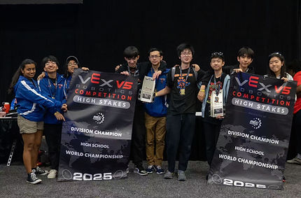 We competed in the 2025 VEX VRC World Championship in Dallas, TX, in May. We won our division of 83 teams to advance to the overall finals, where we reached the Grand Finals. Overall, we finished 2nd out of 823 teams from across the world.